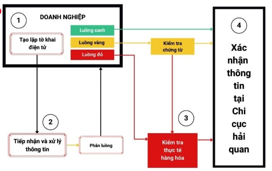Doanh nghiệp mở tờ khai → được phân luồng → hoàn thành nghĩa vụ thuế → Hải quan xác nhận thông quan.